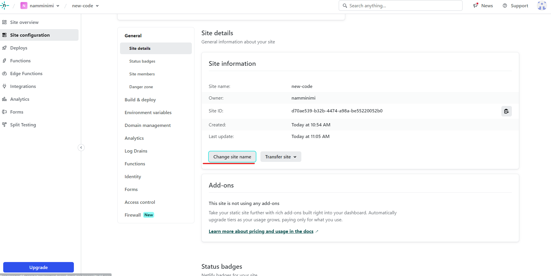 아래 이미지 밑줄 그어놓은 change site name 클릭