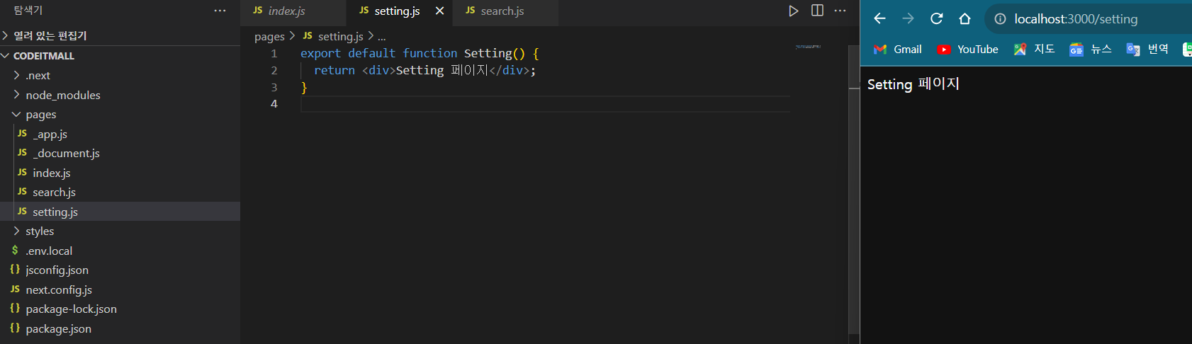 page폴더에 setting.js 와 search.js 파일 만들고 웹사이트 경로 확인해본다