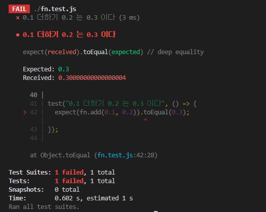 test("0.1 더하기 0.2 는 0.3 이다", () => {