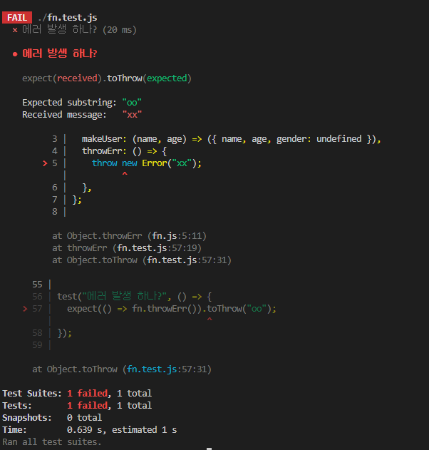 | toThrow | 어떤 작업을 했을 때 특정 에러가 발생하는지 테스트 할 때 |