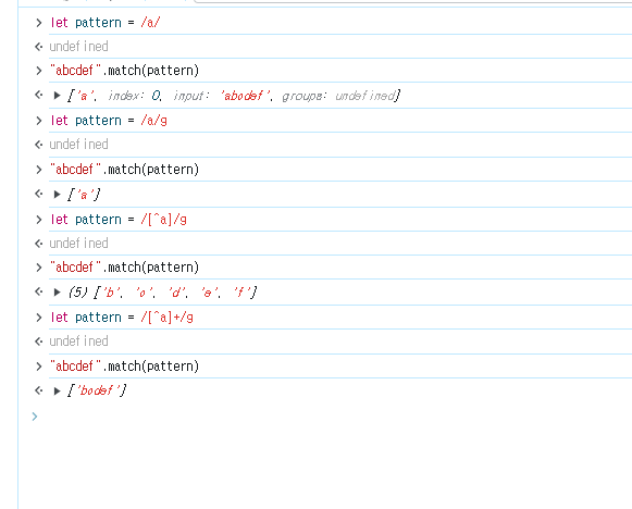 // a를 제외한 나머지 값을 배열로 리턴 받을려면 부정 문자셋인 [^]추가